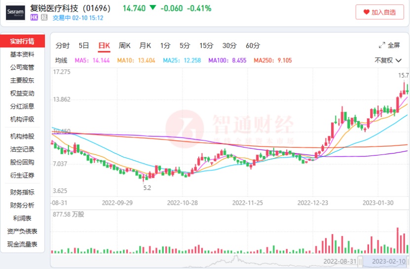 智通财经APP观察到,作为港股能量源医美的代表,复锐医疗科技的股价自去年10月起随港股创新药械行情启动,在经历2波稳定向上走势后,随着国内防疫政策开放,其股价在12月底正式起飞,并迅速实现翻倍增长。自去年10月12日至今年2月9日的近4个月中,公司累计最高涨幅达到201.9%。