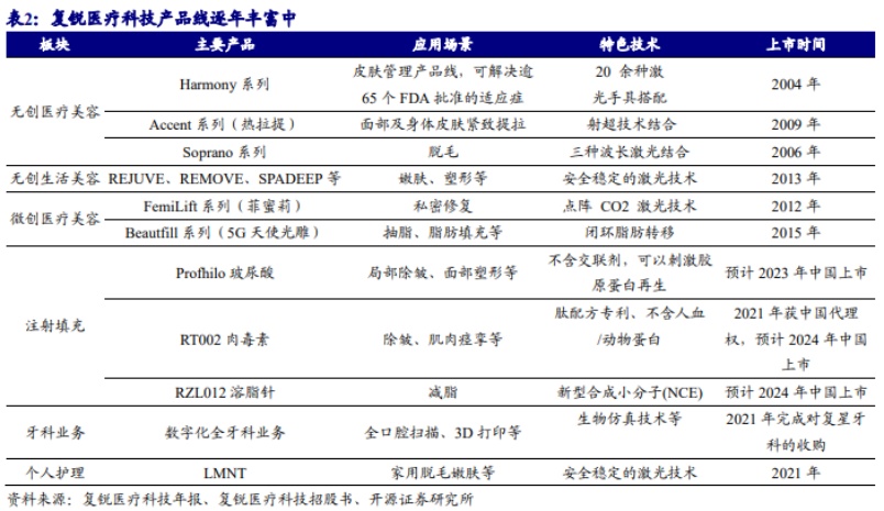 2021年公司和复星医药订立再许可协议引进、使用、销售及商业化长效肉毒素RT002,同时公司引进的注射用透明质酸钠溶液(PROFHILO)也已经正式启动有效性和安全性临床试验,注射填充业务产品管线进一步得到扩展;同年,复锐完成了对复星牙科的收购并整合了数字牙科平台;2022年公司又对瑞克布朗投资了3500万人民币,持有瑞克布朗23.2%股权。
