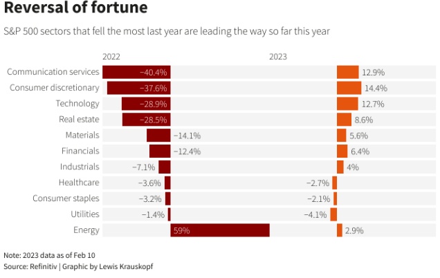 智通财经APP获悉,去年遭受重创的美股于2023年的最初几周飙升,引领市场行情出现复苏。但一些投资者认为,这种趋势不太可能持续下去。英伟达(NVDA.US)、Netflix(NFLX.US)和Meta(META.US)等公司股价的惊人涨幅,提振了在去年包括科技和通信服务于市场抛售中苦苦挣扎的行业投资信心。