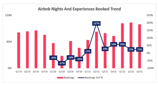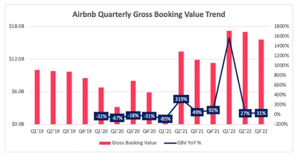 上图显示,由于2020年的新冠封锁和2021年的复苏,爱彼迎的GBV趋势一直很普通,但在2022年开始接近正常。事实上,2022年第三季度的GBV同比增长31%非常令人印象深刻,这表明旅游行业(或者至少是爱彼迎)比预期的更有弹性。