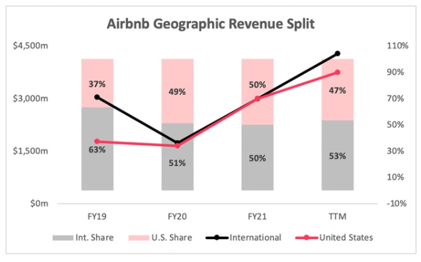 最后一点要说明的是,与美国市场相比,爱彼迎国际市场的复苏情况。随着欧洲封锁持续时间的延长,美国从2020年和2021年开始占据爱彼迎越来越多的收入份额。