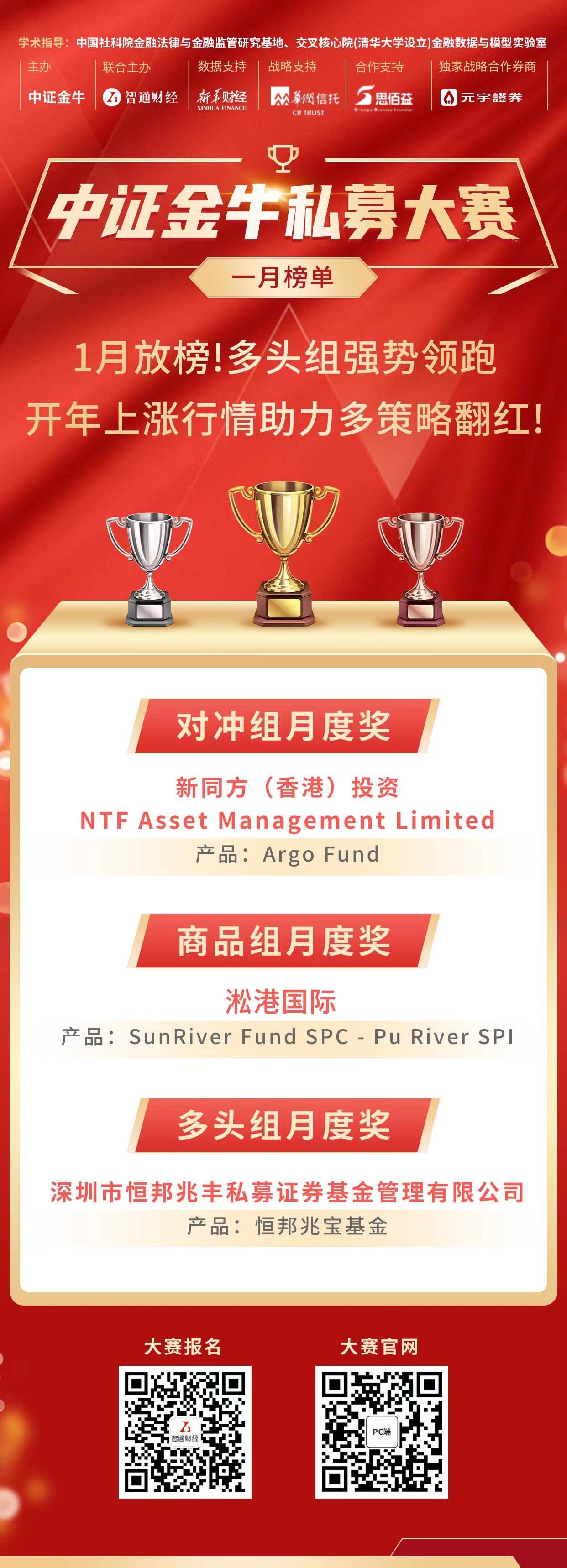 中证金牛2022私募大赛于2022年12月1日正式开启。经过2023年首月的精彩较量,各参赛组的“佼佼者”脱颖而出!根据截至1月31日的排名结果,机构赛对冲组的月度奖获得者由新同方(香港)投资NTF Asset Management Limited旗下“Argo Fund”产品摘得;商品组月度奖获得者由淞港国际旗下“SunRiver Fund SPC - Pu River SP I”产品摘得;多头组的月度奖获得者由深圳市恒邦兆丰私募证券基金管理有限公司旗下“恒邦兆宝基金”产品摘得。值得注意的是,参赛私募产品开年1月全部实现正收益!