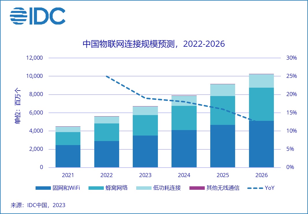 从连接技术来看,得益于中国5G、光纤宽带等网络基础设施的大力发展,以蜂窝网络连接增长强劲,带动固移融合、宽窄结合的物联接入能力迅速提高。中国蜂窝网络连接数增速最快,在中国政府和运营商的积极推广建设之下已实现"物超人",2022年底实现18.45亿个,在公用事业、智能制造、车联网、智能家居等领域广泛应用,预计将以21%的增速到2026年实现36.3亿个。低功耗连接商用进程不断加速,2021年连接数近6亿个,预计到2026年将达14.9亿个。固网及WiFi在家居、工厂等局域稳定环境将持续发挥主要连接能力,在总连接量中占比过半,预计到2026年增至51.1亿个。