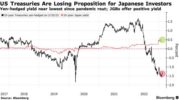 如果植田和男调整政策并推动日本国债收益率走高,日本国债日益增强的相对吸引力肯定会吸引日本大型保险公司和养老基金加速其海外资金的回流。即使植田和男将政策变化控制在最低限度,也可能会再次给日元带来压力并增加日本投资者的汇率对冲成本,而这正是去年促使日本投资者抛售海外债券、转向日本国债的一个关键因素。数据显示,在汇率对冲的基础上,日本投资者目前持有美国十年期国债的收益率约为-1.32%,而类似期限的日本国债收益率约为0.5%。