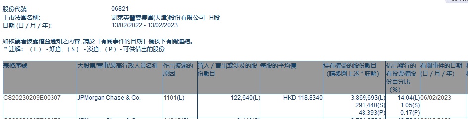 智通财经APP获悉,香港联交所最新资料显示,2月6日,小摩增持凯莱英(06821)12.2640万股,每股作价118.8340港元,总金额约为1457.38万港元。增持后最新持股数目约为386.97万股,最新持股比例为14.04%。