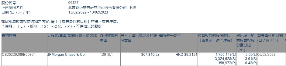 智通财经APP获悉,香港联交所最新资料显示,2月6日,小摩减持昭衍新药(06127)36.7340万股,每股作价39.2191港元,总金额约为1440.67万港元。减持后最新持股数目约为476.61万股,最新持股比例为5.60%。