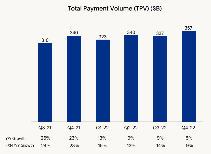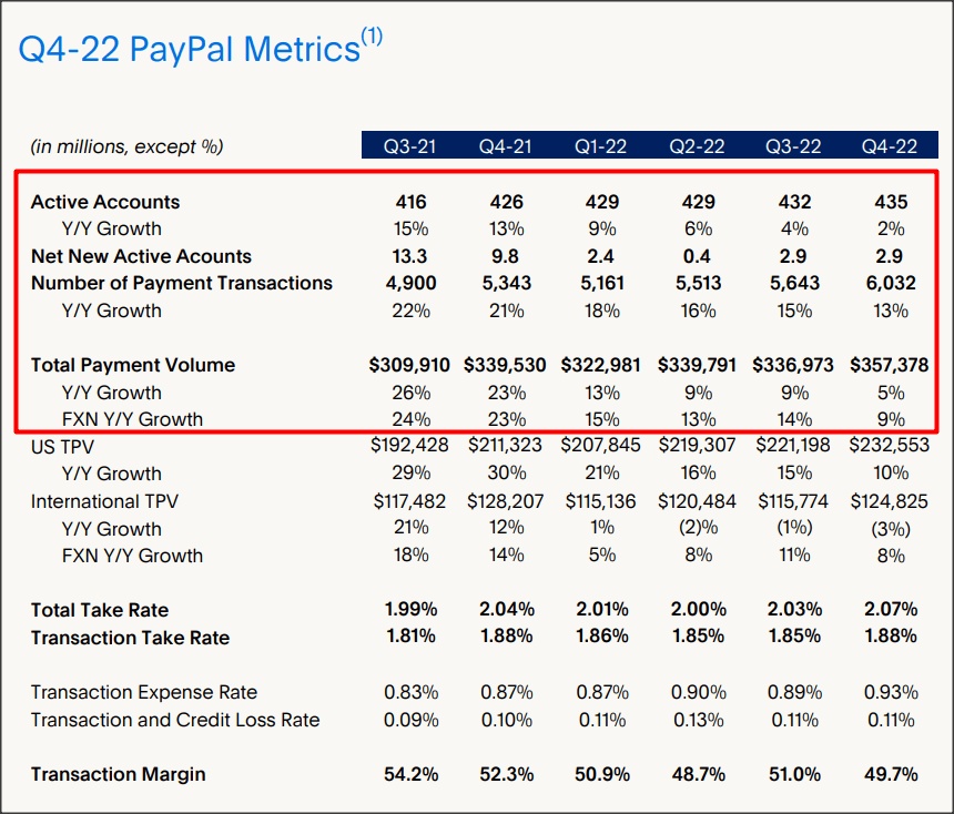 此外,PayPal Q4净新增活跃账户290万个,与上季度持平;截至四季度末,该公司拥有4.35亿个活跃账户,这意味着该公司在2022年净新增了860万个活跃账户,而这4.35亿个活跃账户中包括3500万个活跃商家账户。考虑到该公司面临的行业逆风,其四季度表现相当不错。