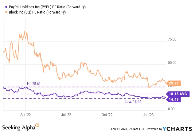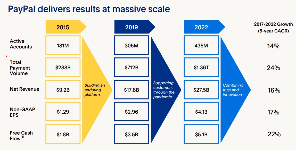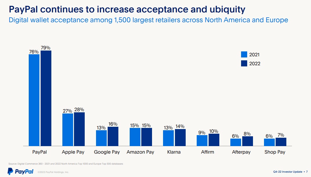 尽管营收和TPV增长明显放缓表明2023年电子商务环境仍充满挑战,但PayPal值得投资的关键优势在于其支付网络的规模。PayPal的平台上有4.35亿活跃账户,没有其他金融科技公司的支付网络规模能与其相比。PayPal在北美和欧洲被广泛接受,这为其他金融科技公司创造了很高的进入壁垒。接受PayPal支付的商家数量众多,这也是该公司的一个重要竞争优势。