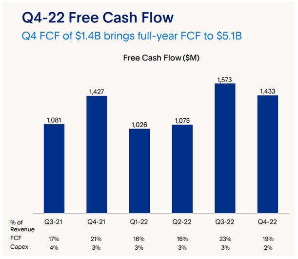 这些优势使得PayPal在每个季度都能产生巨额的自由现金流。PayPal在Q4的营收为74亿美元,自由现金流为14亿美元,这意味着自由现金流利润率为19%。PayPal 2022年的自由现金流总额为51亿美元,自由现金流利润率同样为19%。庞大的支付网络规模和客户群是PayPal业务的护城河,帮助该公司产生稳定和可预测的自由现金流。