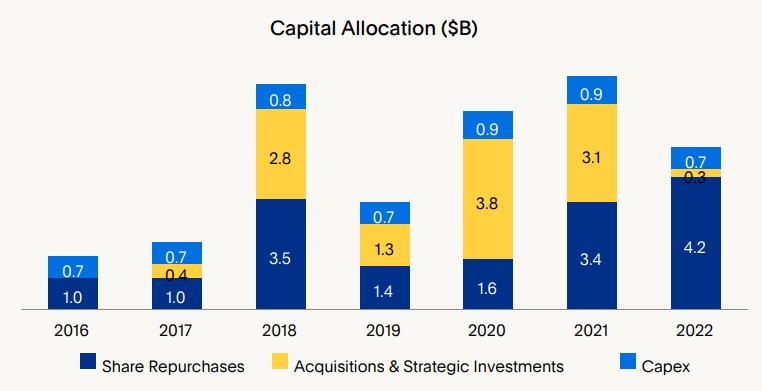 PayPal在Q4回购了10亿美元的股票,在Q1-Q3期间则回购了32亿美元的股票,即2022年PayPal的股票回购总额为42亿美元,占全年自由现金流总额的比例为82%,高于2021年的69%,这表明PayPal在股票回购方面更加积极。