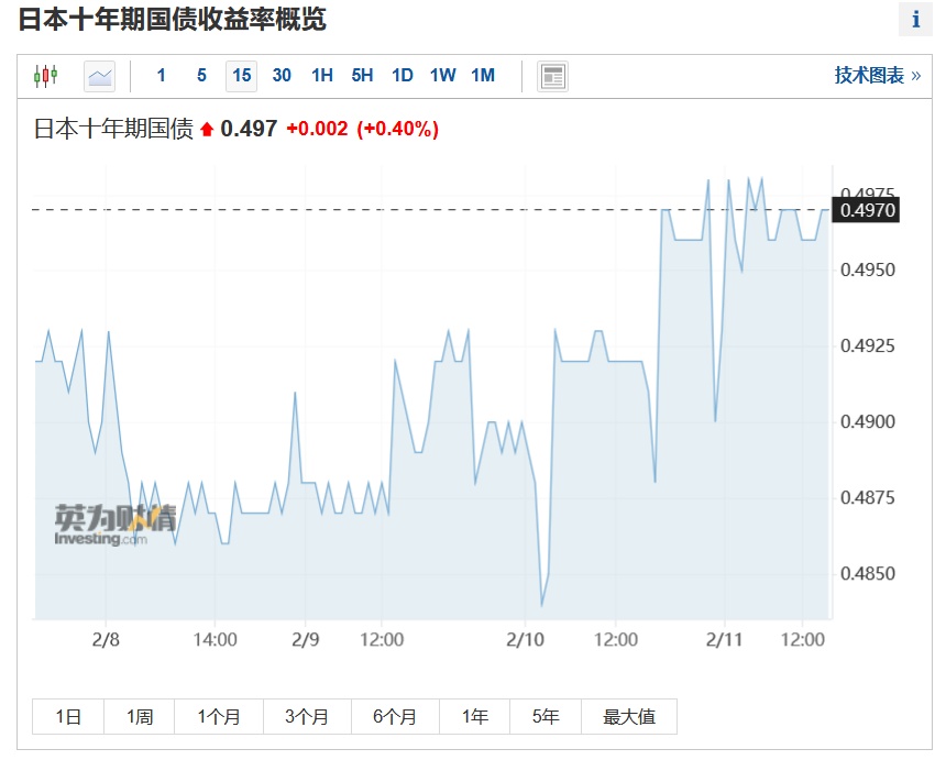 智通财经APP获悉,由于投资者预计日本央行下一任行长可能不像预期的那样鹰派,日本10年期国债周一未有成交。截至发稿,日本10年期国债收益率报0.497%。