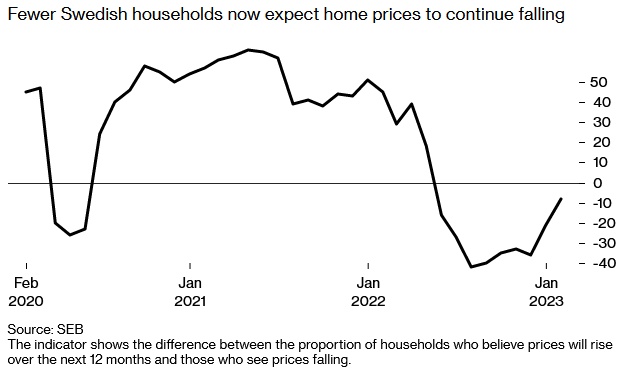 智通财经APP获悉,瑞典银行SEB AB的一项调查显示,近几个月来,越来越多的瑞典家庭对房价走势的看法已不再那么悲观,原因是电价有所缓和、以及人们预期加息可能接近尾声。数据显示,SEB 2月房价指标从1月的-21升至-8,为连续第二个月回升。