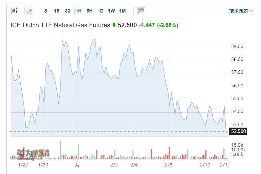 智通财经APP获悉,瑞典近日将其停电风险从“真实”下调至“低”,这表明欧洲最严重的能源危机或许已经过去,至少本季度是这样。在市场对该地区稳定发电的信心增强之际,欧洲天然气价格跌至近4周以来的最低水平。截至发稿,荷兰TTF天然气近月期货下跌2.68%,报52.5欧元/兆瓦时。