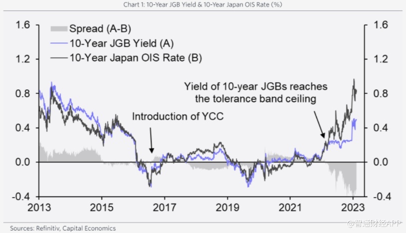 凯投宏观将10年期日本国债收益率与10年期隔夜指数掉期(OIS)利率进行了比较,两者走势相似并且朝着同一个方向运动。OIS利率的上升预示YCC无法持续太久: