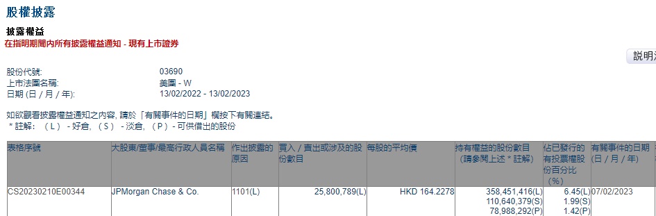 智通财经APP获悉,香港联交所最新资料显示,2月7日,小摩增持美团-W(03690)2580.0789万股,每股作价164.2278港元,总金额约为42.37亿港元。增持后最新持股数目约为3.58亿股,最新持股比例为6.45%。