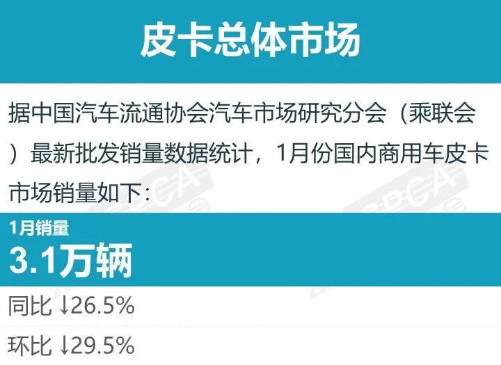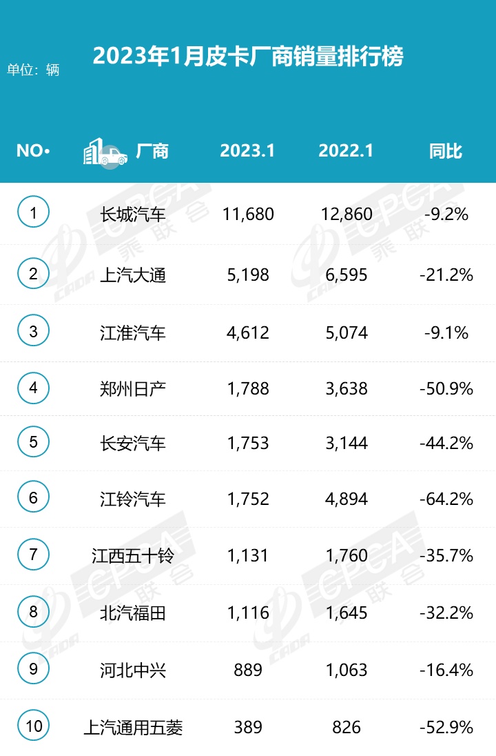 智通财经APP获悉,2月13日,中国汽车流通协会汽车市场研究分会(乘联会)皮卡市场信息联席会发布2023年1月皮卡厂商批发销量排名快报。数据显示,2023年1月份皮卡市场销售3.1万辆,同比下降26.5%,降幅较轻卡的-45%表现强很多。1月皮卡厂商销量排名是国内外市场销量的共同贡献,其中长城汽车(02333,601633.SH)保持强势皮卡领军,部分皮卡企业抓住出口机遇实现强势增量,出口占部分厂商总量超30%。国内零售市场的主力厂商皮卡仍是走势稳健,长城、江铃、郑州日产、江西五十铃的皮卡销势出现“一超三强”的格局。在1月皮卡走势顽强的良好起步下,2023年的皮卡市场必将强势表现。