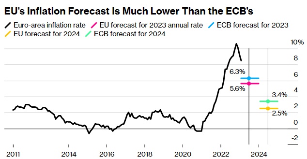 欧洲央行2月份将存款利率上调50个基点至2.5%,尽管通胀率仍接近两位数,高于2%的目标。欧盟委员会周一发布的最新展望报告预计,2024年欧盟价格涨幅将保持在2.5%。媒体对经济学家的调查显示,到2025年,欧元区通胀率仍将略高于目标水平。