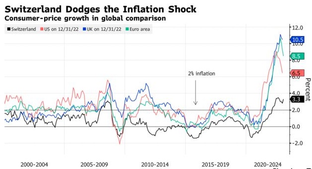 周一最新发布的数据显示,瑞士1月CPI年同比上涨3.3%,在通胀恐慌尚未完全平息之际,一个人口与纽约市相当的国家是如何度过全球金融风暴最严重的时期的,这或许具有启发意义。下面我们可以仔细看看瑞士如何在其他国家中脱颖而出。