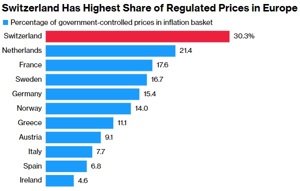 与其他经济体相比,瑞士政府控制价格的比例更大。值得注意的是,家庭电费一年只能调整一次,这就解释了上个月通胀率上升0.5个百分点的原因。
