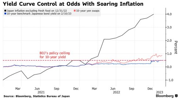 基准收益率本月一直保持在日本央行0.5%的政策上限附近,外界猜测,由于通胀不断上升,日本央行行长黑田东彦的继任者将不得不调整或完全放弃收益率曲线控制计划。