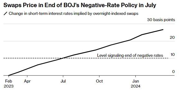 随着日本央行行长提名将于周二公布,债券交易员押注日本央行迟早会进一步调整对收益率曲线的控制,并预计日本央行将在年中左右结束负利率。股票投资者认为,收益率上升将提振银行股。