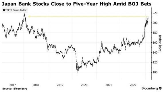 股市方面,日本银行股指数攀升至近五年来的高点,投资者希望日本政府出台政策调整。基准收益率的上限和日本的负利率政策一直是该行业盈利能力的沉重负担。