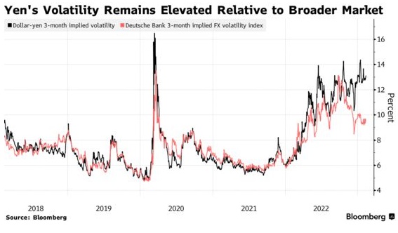 自去年10月以来,日元的3个月隐含波动率一直在上升,尽管整体市场的一个相应指标有所下降,这表明交易员们在提防日本央行再次做出意外举动。