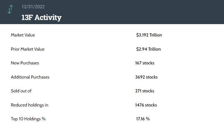 据统计,贝莱德Q4持仓总市值达3.192万亿美元,上一季度持仓总市值为2.94万亿美元。贝莱德在二季度的持仓组合中新增了167只个股,增持了3692只个股;同时减持了1476只个股,清仓了271只个股。其中,前十大持仓标的占总市值的 17.16 %。