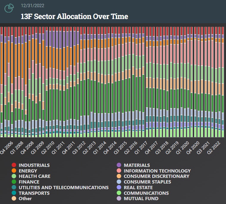 从持仓偏好来看,贝莱德青睐科技股,占总持仓的比例为22.05%。紧接着是金融股和医疗保健股,分别占总持仓的16%和14.43%。