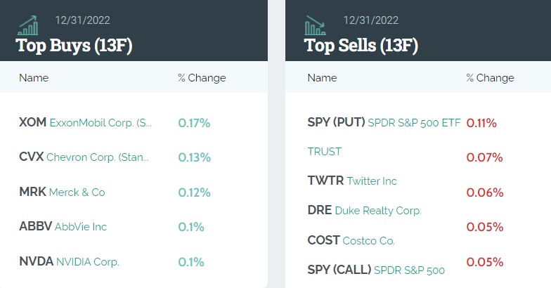 从持仓比例变化来看,前五大买入标的分别是:埃克森美孚、雪佛龙(CVX.US)、默沙东(MRK.US)、艾伯维(ABBV.US)、英伟达(NVDA.US) 。