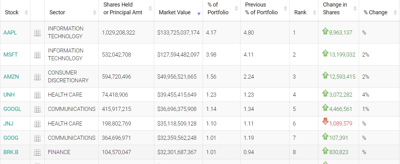 微软(MSFT.US)位列第二,持仓约5.32亿股,持仓市值约1275.94亿美元。
