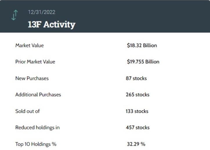 智通财经APP获悉,根据美国证券交易委员会(SEC)披露,全球最大对冲基金桥水递交了截至2022年12月31日的四季度持仓报告(13F)。据统计,桥水四季度持仓总市值达183.20亿美元,上一季度总市值为197.55亿美元,环比下降了7.3%。在四季度的持仓组合中新增了87只个股,增持了265只个股。同时,桥水还减持了457只个股并清仓了133只个股。其中前十大持仓标的占总市值的32.29%。
