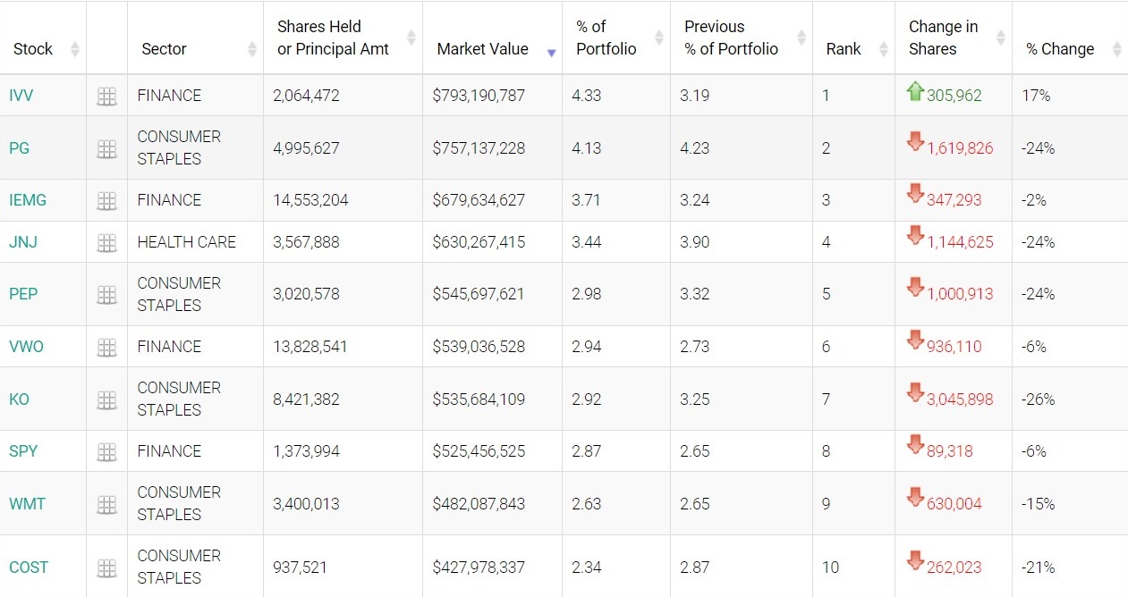 前十大重仓股中,其他分别新兴市场ETF(VWO.US)、可口可乐(KO.US)、SPDR标普500指数ETF(SPY.US)、沃尔玛(WMT.US)以及好市多(COST.US),新兴市场ETF和SPDR标普500指数ETF持仓数量较上季度减持6%,沃尔玛较上季度减持15%,可口可乐较上季度大幅减持26%。
