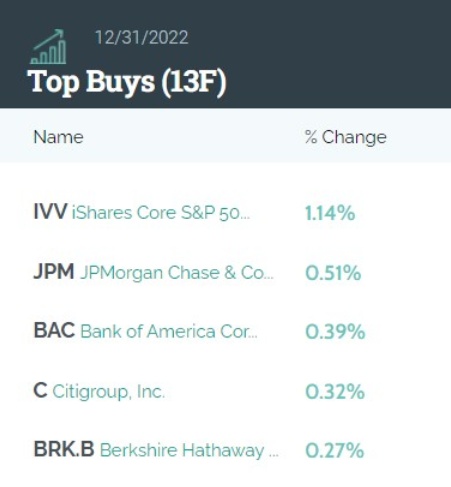 前五大买入标的分别是:iShares标普500指数ETF、摩根大通(JPM.US)、美国银行(BAC.US)、花旗集团(C.US)、伯克希尔-B(BRK.B.US)。
