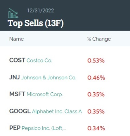 前五大卖出标的分别是:好市多、强生、微软(MSFT.US)、谷歌-A(GOOGL.US)、百事可乐(PEP.US)。
