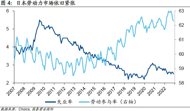与此同时,日本的劳动力市场依旧火热。根据日本厚生劳动省的最新数据,日本2022年12月劳动参与率较上月基本持平为62.3%,失业率也依旧维持在史低的2.5%,紧张的劳动力市场表明未来工资仍有上涨压力。