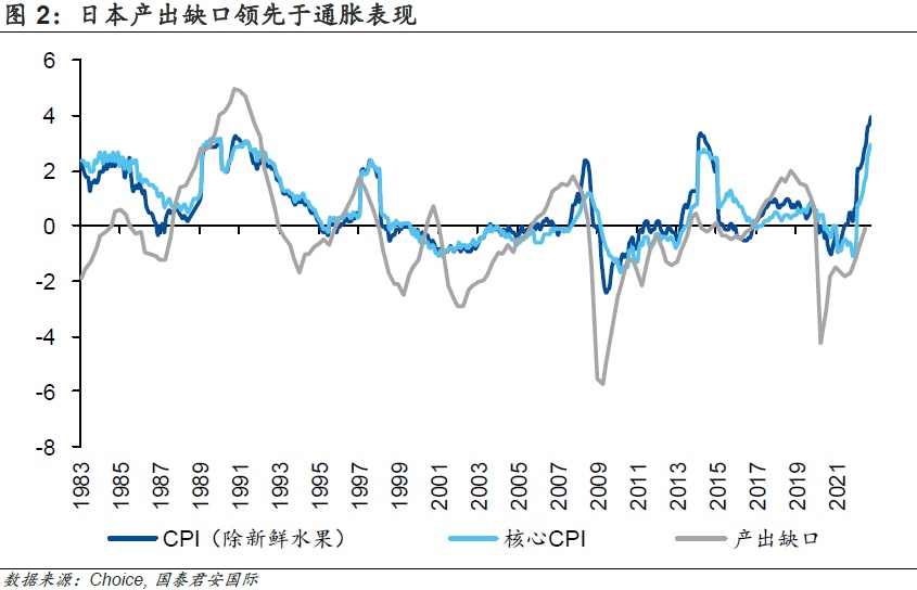 “外生”的通胀压力之外,“内生”的通胀压力不断上升,才是YCC面临的最大考验。从历史经验来看,产出缺口往往领先于日本的通胀率,从目前的趋势来看,日本的通胀缺口已经有转正的迹象,而通胀率已经处于历史高位附近。按照这样的趋势和相关度,日本的整体通胀水平在未来几个季度可能会进一步抬升。