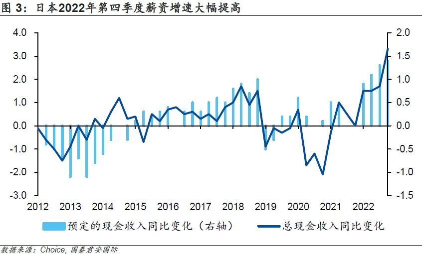 当工资上涨的压力开始成为美国及欧盟通胀中枢上行的核心逻辑后,工资压力是否会推升日本的通胀水平也开始成为一个重要问题。根据日本官方最新公布的工资调查,日本2022年第四季度总现金收入同比增速由第三季度的1.7%大幅提升至3.3%。