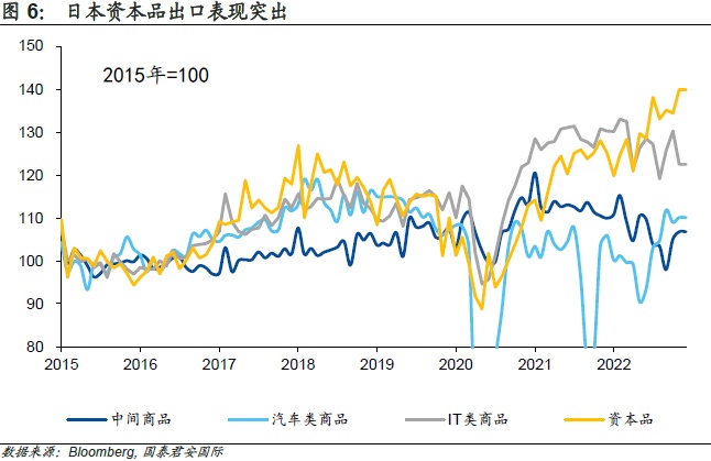 作为重要的工业国,日本在出口端的强劲表现也值得关注。在2021年和2022年,日本出口均保持了两位数的同比增速。更加值得关注的是,剔除了价格影响后的实际出口增速也保持在较高的水平上。而这其中以资本品和IT类商品的表现最为突出。贸易在很大程度上可以作为经济的缩影,资本品主要包括用于生产制造的设备,而日本在这方面有自己的独特优势,与此同时,岸田文雄政府在半导体等关键工业领域也有相当的雄心,政策的加码也可能推动相关产业的进一步发展和升级。