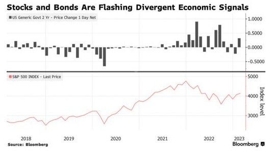 但最近几周,这两个市场的反弹出现了波折。尽管美国国债收益率仍低于2022年底的水平,但两年期国债收益率上周创下去年11月初以来的最大单周涨幅,并在周一继续攀升。虽然标普500指数上周下跌1.1%,但在周一收复了失地,重新确立了2023年近8%的涨幅。