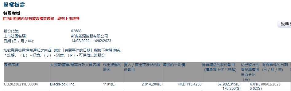智通财经APP获悉,香港联交所最新资料显示,2月8日,贝莱德增持新奥能源(02688)201.42万股,每股作价115.423港元,总金额约为2.32亿港元。增持后最新持股数目约为6798.23万股,最新持股比例为6.01%。