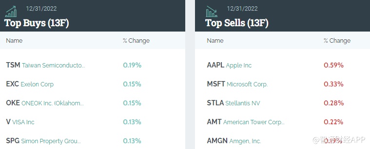 前五大卖出标的分别是:苹果(AAPL.US)、微软(MSFT.US)、Stellantis NV(STLA.US)、美国电塔(AMT.US)、安进(AMGN.US)。