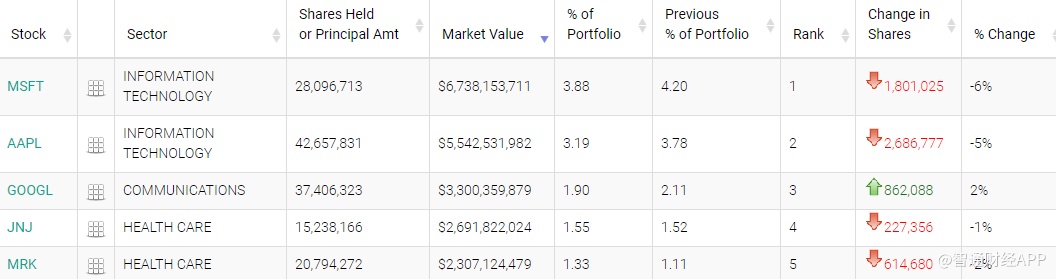 强生(JNJ.US)和默沙东(MRK.US)分别位列第四和第五,持仓市值分别为26.92亿美元、23.07亿美元,分别占投资组合比例为1.55%、1.33%。