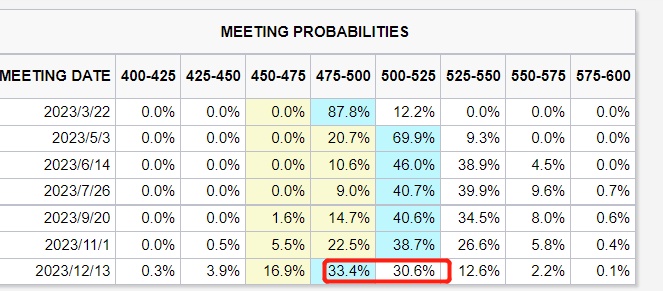 而在市场方面,目前市场对于美联储今年年底是否会降息一次存在巨大分歧;根据芝商所“美联储观察工具”,以美联储今年再加息两次25个基点为准,利率期货市场目前预计美联储年底在约有33.4%的概率将降息一次,而市场还预计美联储有30.6%的概率维持利率不变。