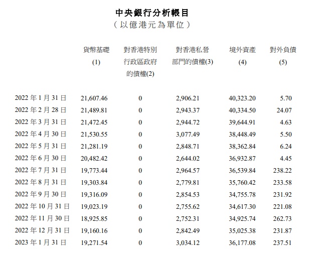 货币基础为19,272亿港元,包括负债证明书、政府发行的流通纸币及硬币、银行体系结余,以及已发行外汇基金票据及债券。外汇基金对香港私营部门的债权总额为3034亿港元。对外负债总额为238亿港元。
