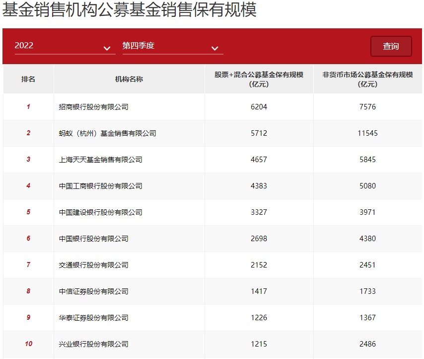 具体来看,股票+混合公募基金保有规模的排名,前十分别为招商银行、蚂蚁基金、天天基金、工商银行、建设银行、中国银行、交通银行、中信证券、华泰证券、兴业银行。其中,前七名与去年三季度末一样。招商银行、蚂蚁基金、天天基金仍位居前三,规模分别达6204亿元、5712亿元和4657亿元;相较去年三季度末的6291亿元、5673亿元和4551亿元,环比则均有所下降。