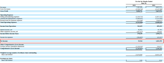 就最新的财报数据而言,该公司的经营状况似乎有了进一步恶化,截至2022年6月30日止6个月,公司实现营收729.54万美元,同比下降15.32%,净利润再降九成,仅录得9.35万美元。
