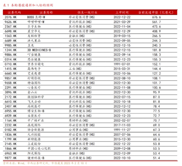 华西证券表示,根据恒生综指及港股通纳入标准,预计本轮将新增31个港股通标的,包括30个满足此次考察期恒生综指纳入标准的标的以及2022年10月3日正式转为双重主要上市的哔哩哔哩-W(09626)。31个新纳入恒指标的当前流通市值分布从51.4亿港元到561.7亿港元,将于3月13日生效,预计港股通会同步调整。此外,2022年12月上市的BOSS直聘-W(02076)属同股不同权公司,需在联交所上市满6个月+20个港股交易日后纳入港股通。此外,根据中国证监会和香港证监会《联合公告》,8家外国公司有望纳入港股通,正式实施时间将由交易所另行通知。