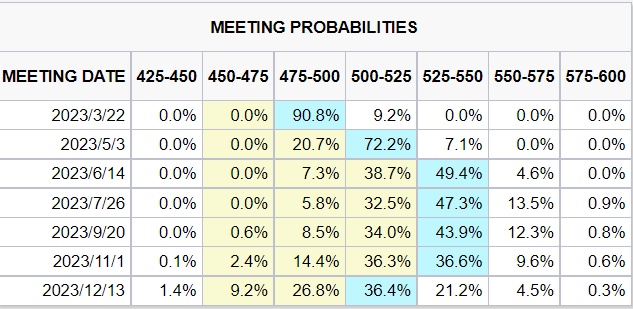 期货合约定价显示,交易员押注美联储将在3月和5月的议息会议上将再各加息25个基点,并预计在6月或7月进一步加息的可能性大致相同,目前的水平为4.5%-4.75%。