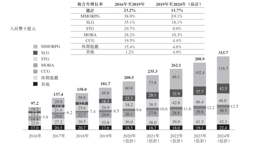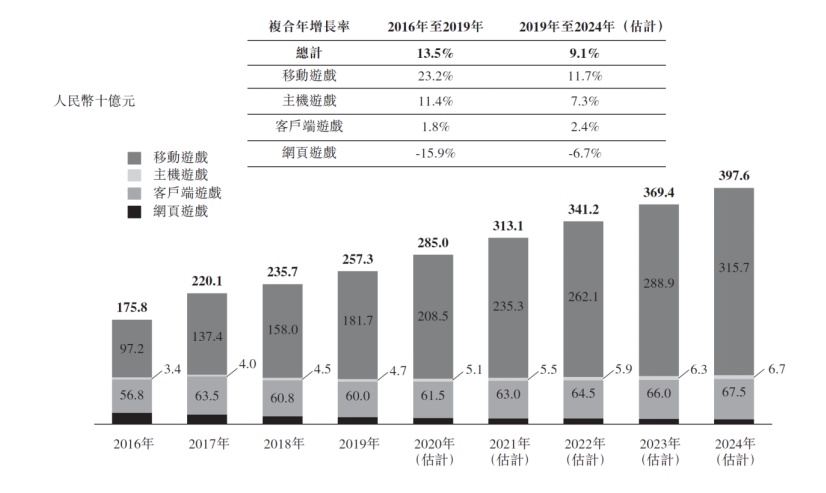 中国游戏行业高速增长,中国内地已成为全球最大游戏市场。根据弗若斯特沙利文,预计2024年游戏市场规模3976亿元,2019-2024期间复合增速9.1%,高于同期全球游戏市场复合增速7.5%。其中中国内地移动游戏市场规模增速最快,预计2019-2024期间复合增速达11.7%,高于同期主机游戏、客户端游戏和网页游戏增速。